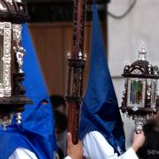 Insignia que abre el cortejo procesional, flanqueada por dos nazarenos que portan faroles.
