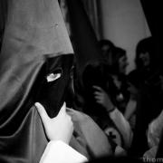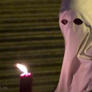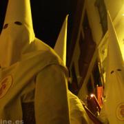 Los miembros de la hermandad que componen el cortejo pocesional portando cirios o insignias, vestidos con túnicas y cubiertos por el capirote y el antifaz.