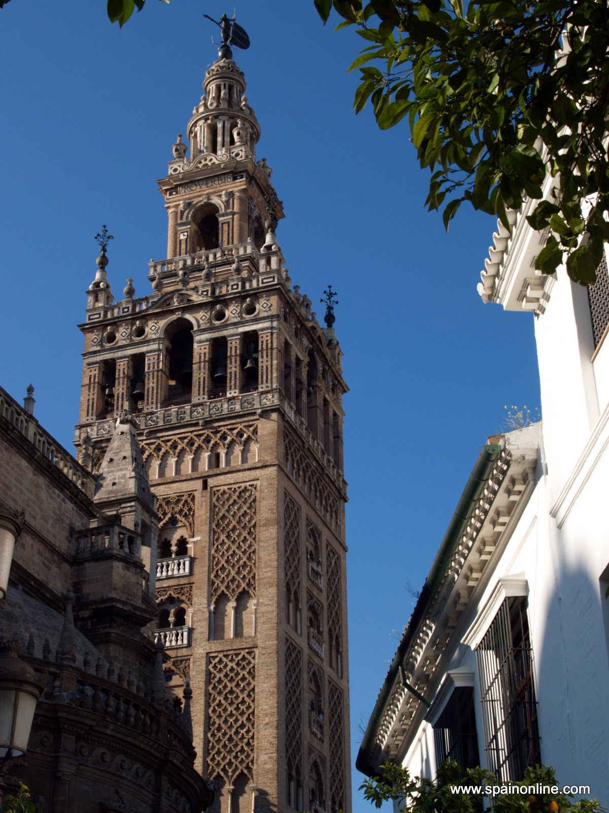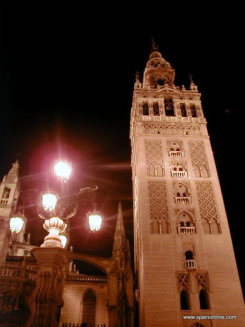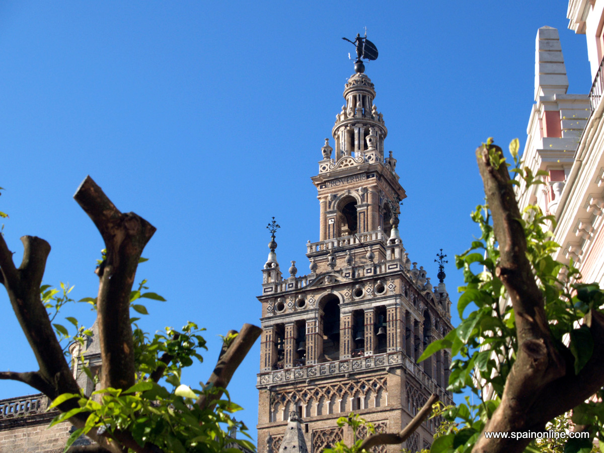 La Giralda es el monumento emblemático de Sevilla. Este minarete de estilo Almohade fue construido por los Moros entre 1184 y 1197 hasta una altura de 76 metros. El minarete de la antigua mezquita estaba coronado por tres bolas doradas que desaparecieron en el siglo XIV debido a un terremoto. En 1586, después de la reconquista, los cristianos añadieron el campanario, alcanzando una altura de casi 100 metros. En 1987 fue declarado Patrimonio de la Humanidad por la UNESCO junto con la Catedral de Sevilla, los Reales Alcázares y los Archivos de Indias.
